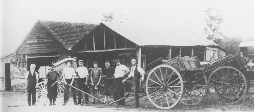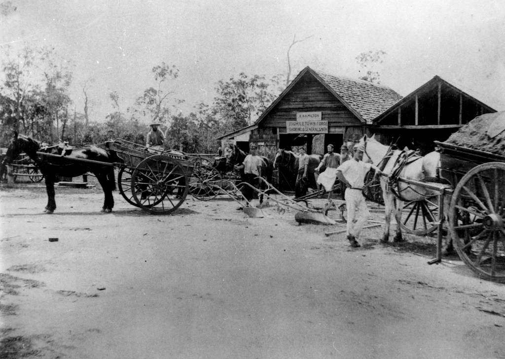 Slideshow: Early Chermside men enjoyed leaning on things – at Hamilton’s Blacksmith’s, a second blacksmith’s, TA Hamilton’s Fuel Depot, and Ida Grantham’s Shop. (State Library of Queensland – SLQ).