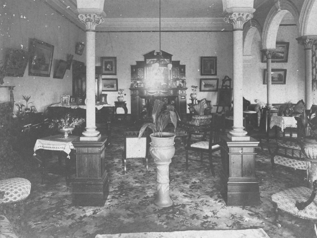 Left: The imposing exterior of Stanley Hall. Right: The daunting interior of Stanley Hall. Navigating all of that bric-a-brac would have been quite a test of skill and sobriety. (SLQ.)