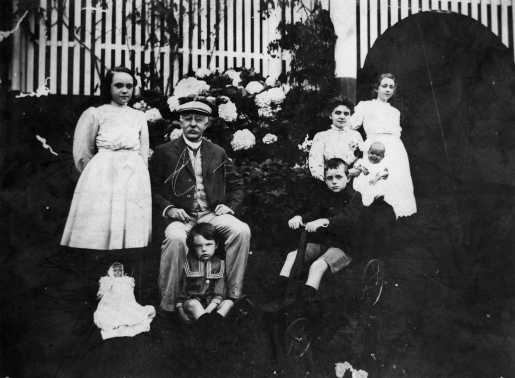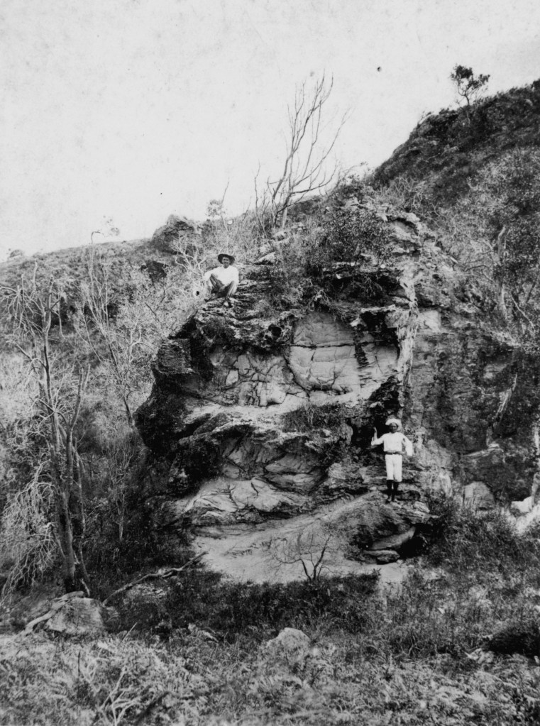 Left: Generations of the Heindorff family at Clayfield. Right: A man and a boy climb a cliff-face at Hutton Street. (SLQ).