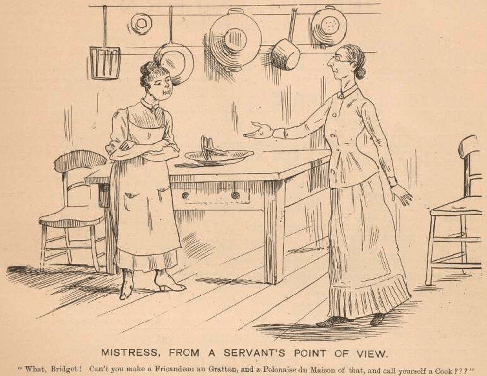 The positions vacant section of the newspapers teemed with offers of work in service for women, but these jobs tended to be thankless and poorly-paid domestic labour. Female servants were often depicted in cartoons decrying their general slovenliness and/or incompetence. The cartoon below, from the Lantern magazine in 1884 flips the usual scenario a tad.