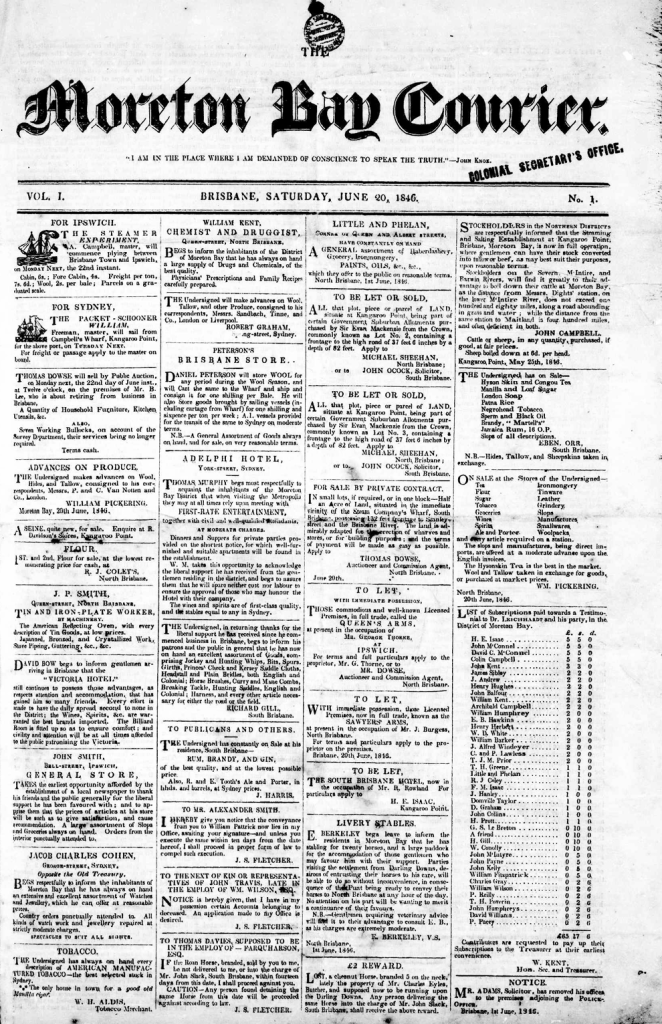 A new township needed a newspaper, and in June 1846, the Moreton Bay Courier was published. It began as a weekly paper, with special editions created when major news broke. The Courier is still published but no longer in broadsheet form. Its archives provide an astonishing insight into Queensland through the years – for better or for worse.