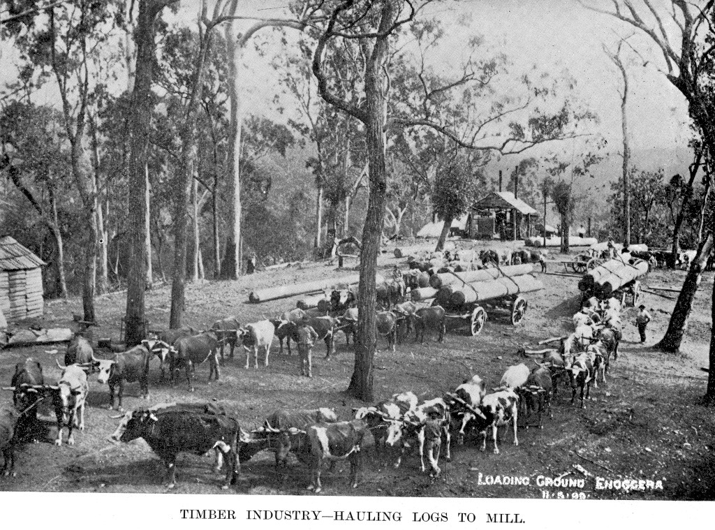 Left: Enoggera in the 1890s, looking towards the sale yards and the Newmarket Hotel. Right” Cattle teams hauling logs, Enoggera, 1893.