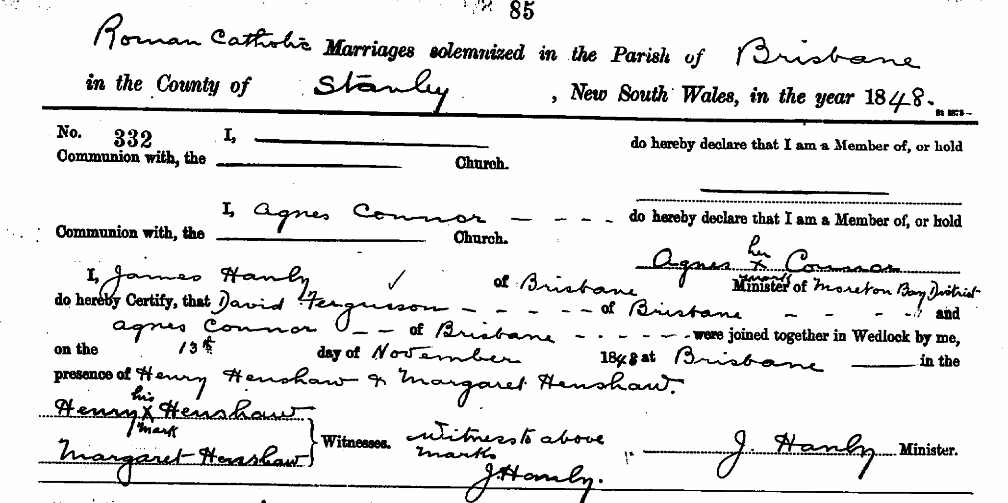 At any rate, Miss Agnes Conner, as she called herself, was married to David Ferguson by the Reverend Hanly at Brisbane Town on 13 November 1848. David Ferguson was a ticket of leave man, having been convicted of highway robbery at Norfolk in 1834, and sentenced to transportation for the term of his natural life. He had been born in 1810, making him five years older than Agnes. There were no children from this marriage, and David informally adopted Charles junior, who was known as Charles Ferguson until he reached adulthood.