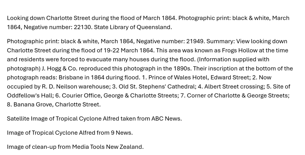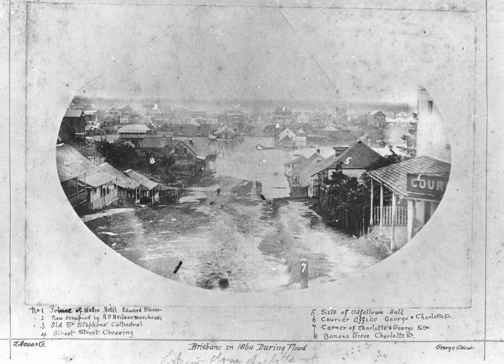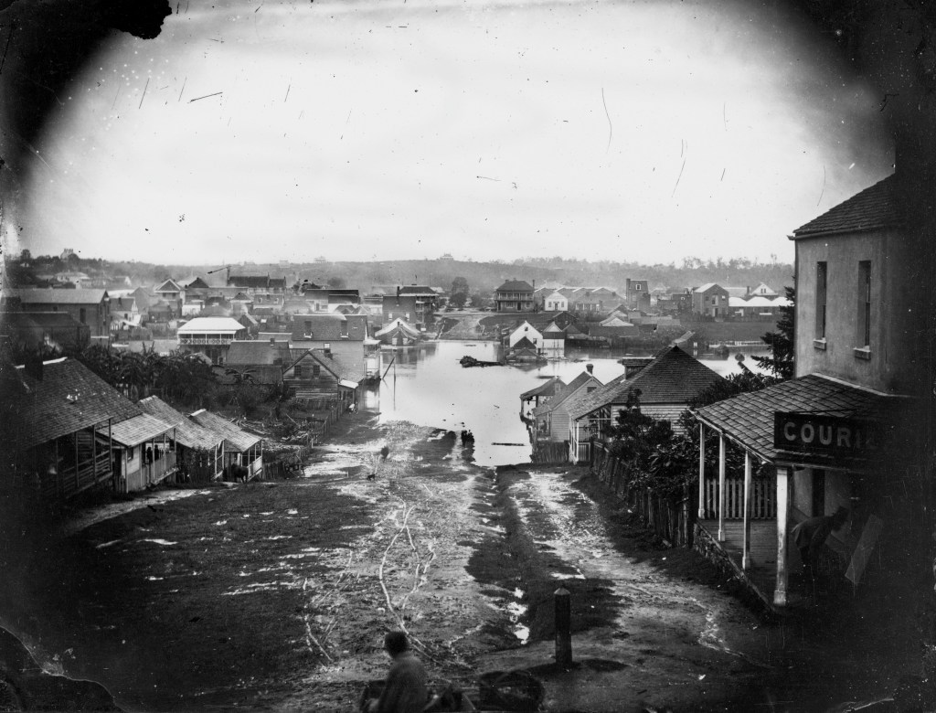 “In Brisbane the water gradually rose throughout the whole of yesterday; and, at 4 o’clock in the afternoon Albert-street, from Alice-street to Charlotte-street, was totally impassable, and many of the residents in Frog’s Hollow were compelled to leave their houses and furniture to the mercy of the devastating element. Two men were seen swimming after an erratic table in the hollow between Charlotte and Mary streets; in various other low-lying localities of the town, similar scenes were enacted.