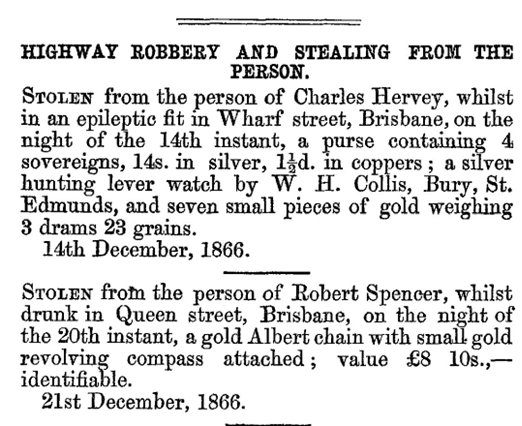 It fascinated me that the Police had the exact age, profession and description of the offender, but no name. As it turned out, the Gazette was published just before the matter came to court. Mr Bennett and the accused (a Thomas Williams) had been staying at the same boarding house, and, after a few drinks, they decided to go to the house of a Mrs Wilson. There Bennett fell into a boozy doze, and Williams stole the cheques. Mrs Wilson returned Bennett’s cheques to him, but only after trying to cash them all over Brisbane Town. And failing. Williams got 14 weeks for stealing from his unconscious friend.