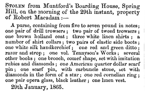 Someone nicked a strange assortment of things from a boarding house in Spring Hill. Clothes, jewellery, and a copy of Tennyson’s Works. I can’t imagine the average colonial thief suddenly experiencing an urge to read “Maud.”