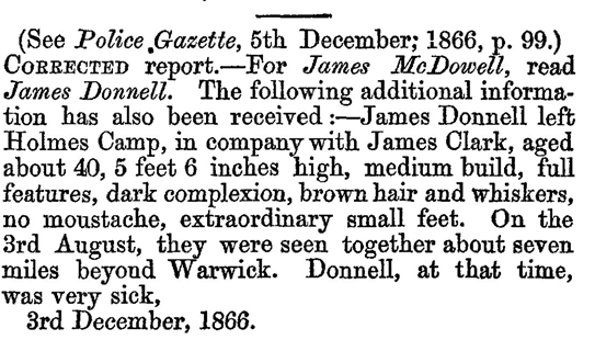 William Jones, alias Ned Randall, – a native of Ireland, more like a native of the colonies, about 5 feet 7 or 8 inches high, 25 years of age, fair complexion, rather pale, long fair hair, small straight nose, blue eyes, small fair whiskers, slight moustache (if any); dressed in moleskin trowsers, brown felt hat, grey Crimean shirt, a tweed coat in swag, and pair of Wellington boots.
