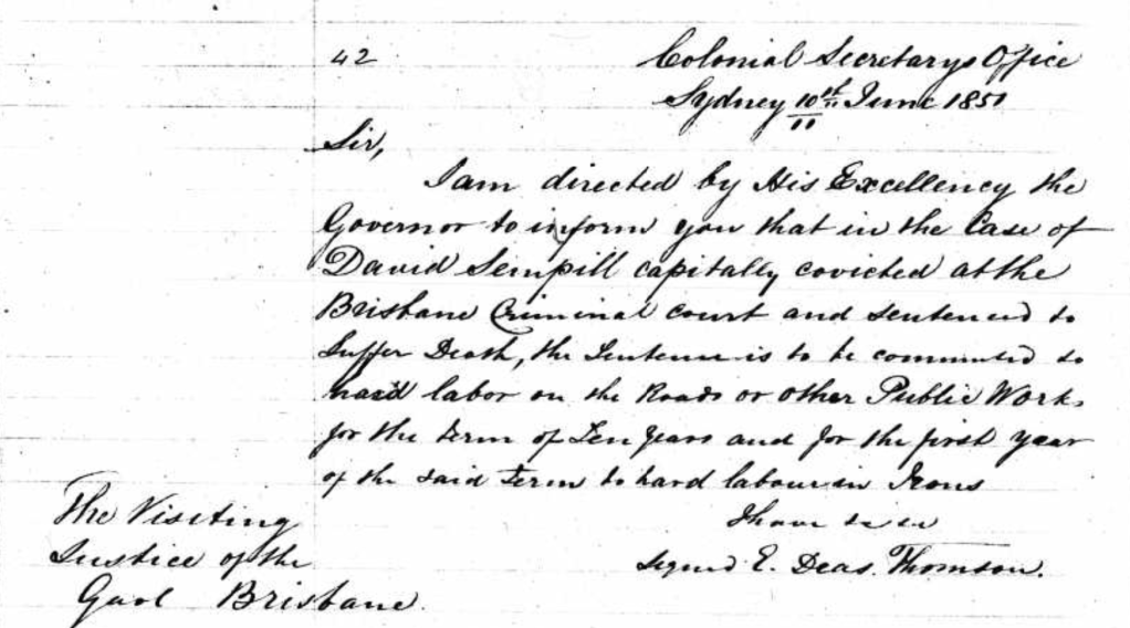 On June 11, a brief letter was sent to Moreton Bay, advising that the sentence had been commuted to 10 years of hard labour on the roads and public works of the colony, the first year to be spent labouring in irons. David was sent to Sydney, placed in Darlinghurst Gaol, and then sent to Cockatoo Island to serve his time.