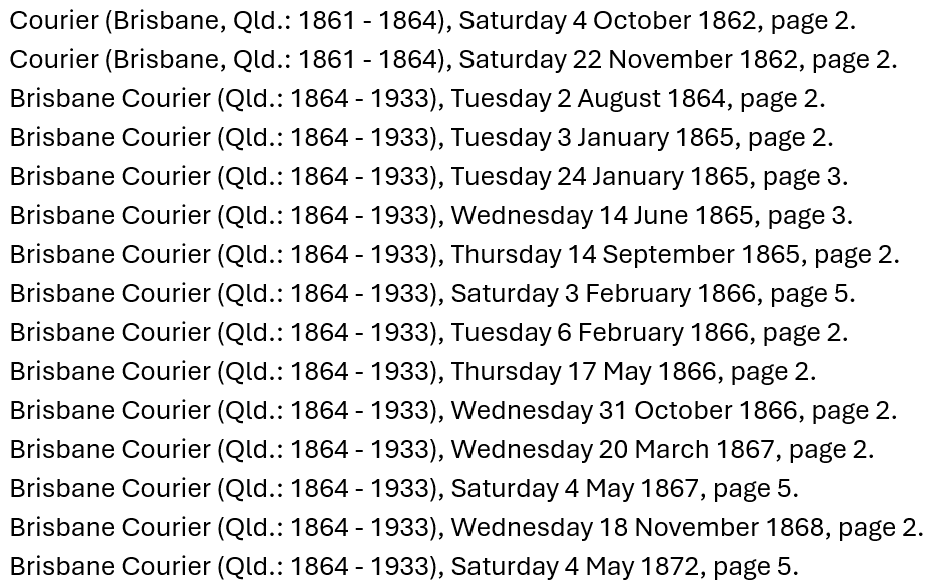 John Callaghan[vi] appeared on summons at the Police Office, yesterday, being charged by Ann Clickard, a damsel of venerable appearance[vii], with making violent love to her on the previous Thursday evening. It appeared that the parties lived at Fortitude Valley, the complainant residing with a Coolie settler[viii], as his servant, and the defendant being a married man. On the night mentioned he introduced himself to the house where she was, and after sundry invitations to meet him by moonlight alone, he proceeded to further freedoms, which constituted the assault complained of. The complainant stated that she was married to a person named “Anthony,”[ix] but did not know his other name. A witness was produced for the defence, who deposed that complainant had offered to forego this charge if Callaghan would give up a claim which he had against her employer, for fencing work. The Bench, however, considered an assault proved, and fined Mister Callaghan, 6s 10d. and 13s. 2d. costs, which was paid.
