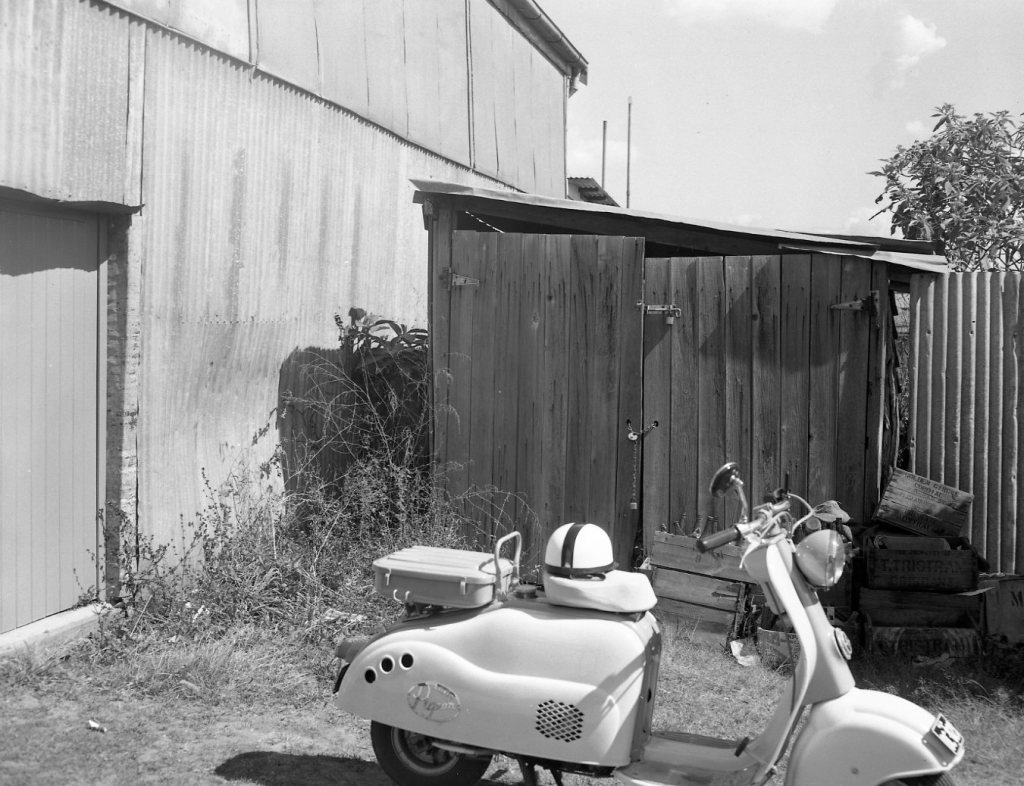 - Pigeon Scooter in backyard at Graceville, 1959 (BCC)