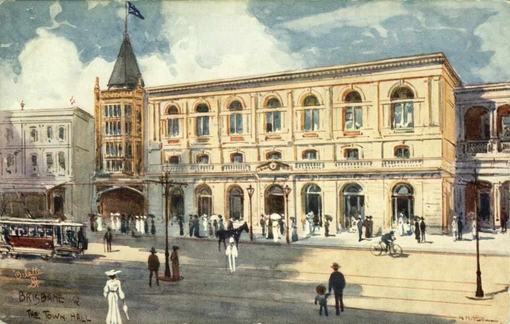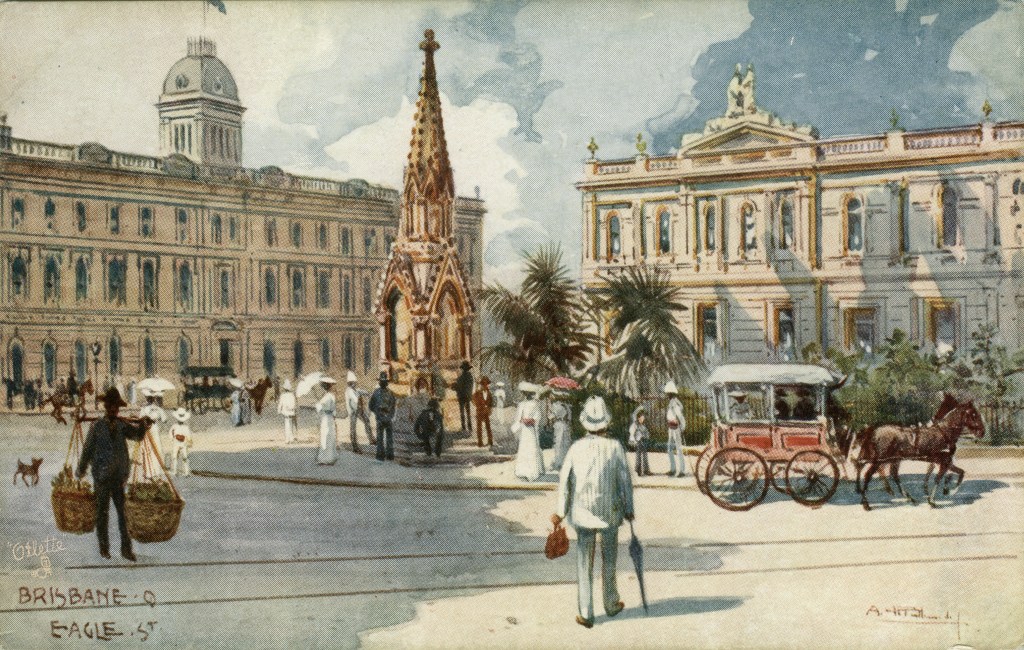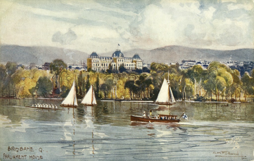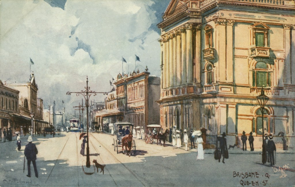 Albert Fullwood took the images of Brisbane in 1895, which were the basis of postcards coloured by the “oilette” tecnhnique. These renderings kept the sharp edges of a photograph, but laid on a wash of colour and detail to the images. Idealised, yes, but an arresting view of a subtropical city at the end of the 19th century.