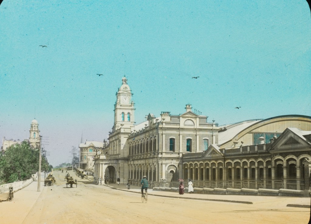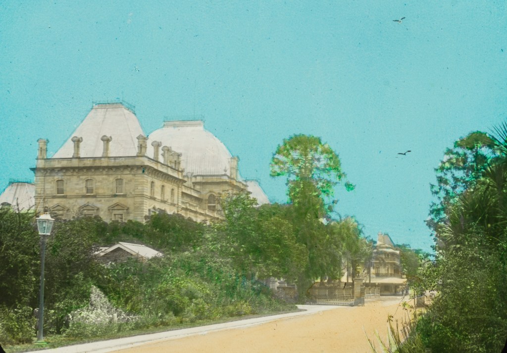 Old Government House, now part of Queensland University of Technology’s Gardens Point campus. With added birds.Whatever was going on at Old Government House, it was festive and well-attended by a sun-safe crowd. The birds must have fled due to the commotion.Ah, that’s where the birds went – Central Station. Central is still visible today, although thoroughly overshadowed by office buildings.Those birds that weren’t hovering over public buildings chose to perform aerial surveillance of the Queensland Club. They probably have a better idea of whatever it is that goes on in there than any woman has in the past 141 years.The (Old) Queensland Museum building, under a particularly blue sky. Presumably the birds were too absorbed by the goings-on in the Queensland Club gardens to spare any time hovering here.Fernberg had become the new Government House, and remains so today. As at the time of writing, no-one has thought to surround it with a University.The Windmill, Wickham Terrace. Obligatory gent leaning against a fence.Produce market in Turbot Street. Hard to imagine today.