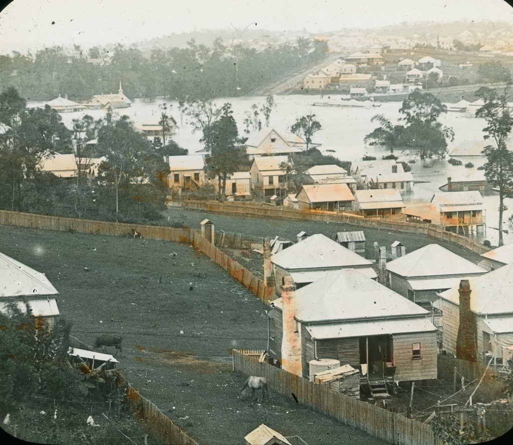 The first set of colourised slides of Brisbane in the State Library collection depict the flood of 1893. Adding some (slight) colour to them brings out some detail that would be lost in black and white, particularly the height of the water compared to the banks and houses.