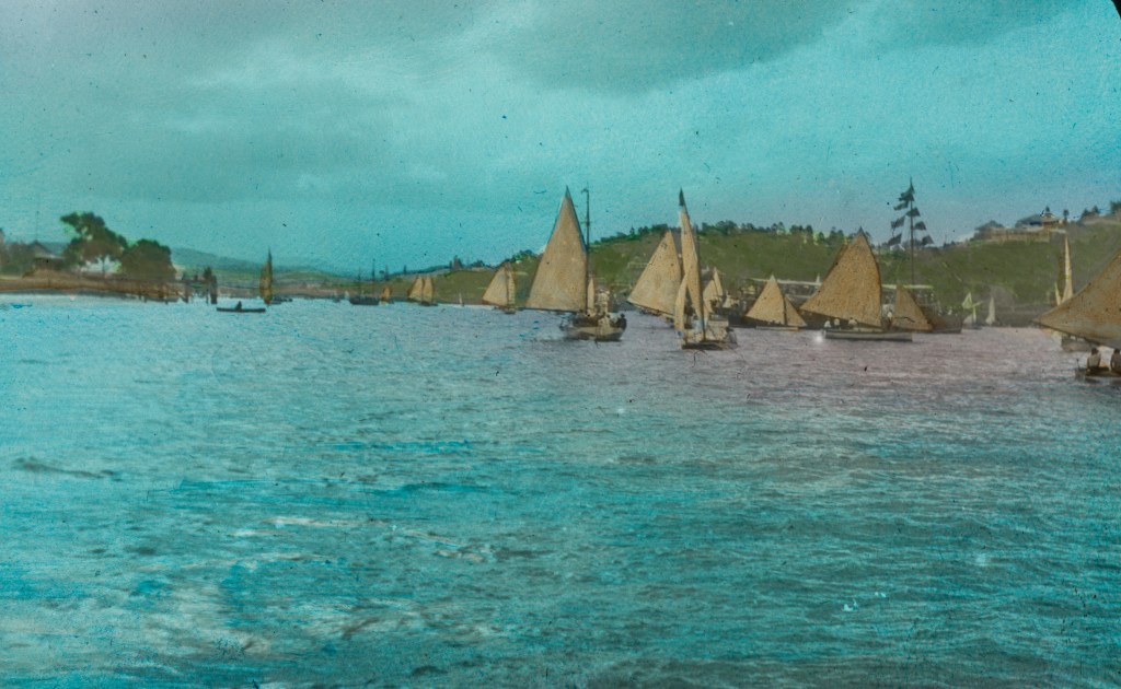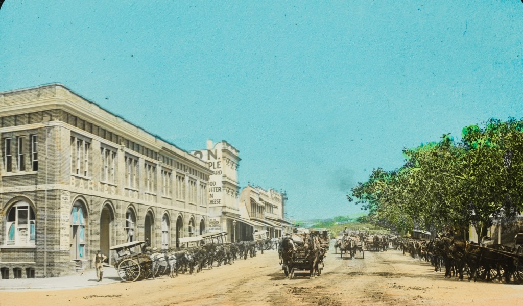 In the first decade of the 20th century, a series of colourised lantern slides were taken of Brisbane. Colourised hardly begins to describe the lurid aqua of the skies and waters, but the buildings and people have been tinted with a degree of accuracy, or at least restraint, that brings the old town to life in a way that black and white or sepia could not. (Note the birds added to just about every skyscape. Presumably, no sky could fail to be bright blue, nor could it fail to contain a sprinkling of bird life.)