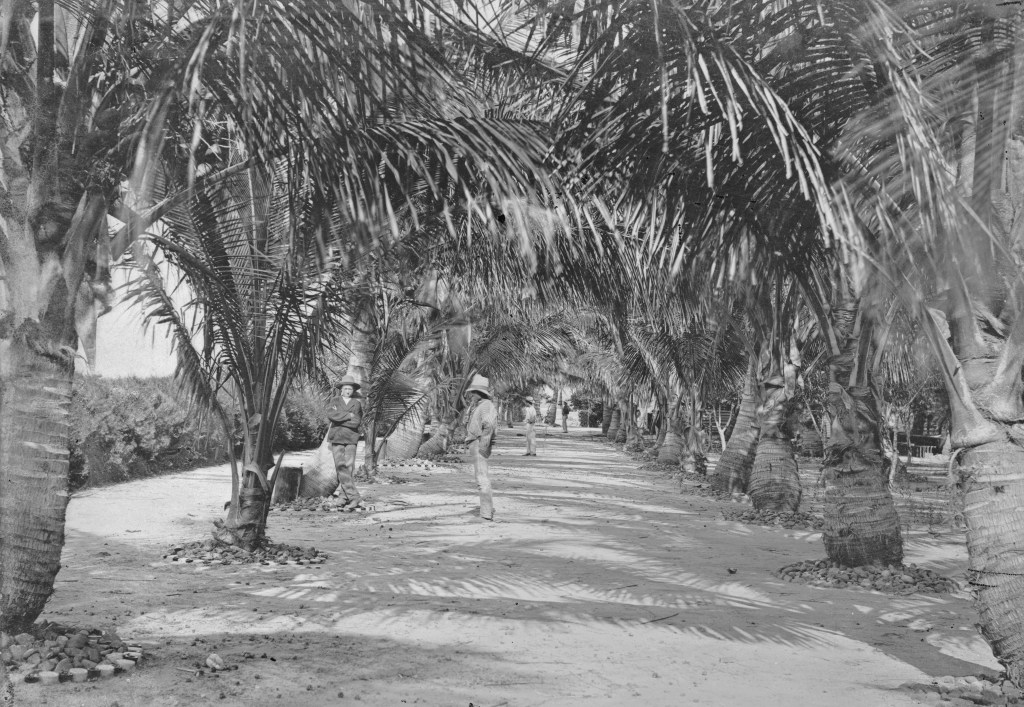 An avenue of palm trees, Mackay area. I’d bet London to a brick that the men standing around in this tropical idyll were dreaming of hedgerows and cool weather, oblivious to the glorious scenery.