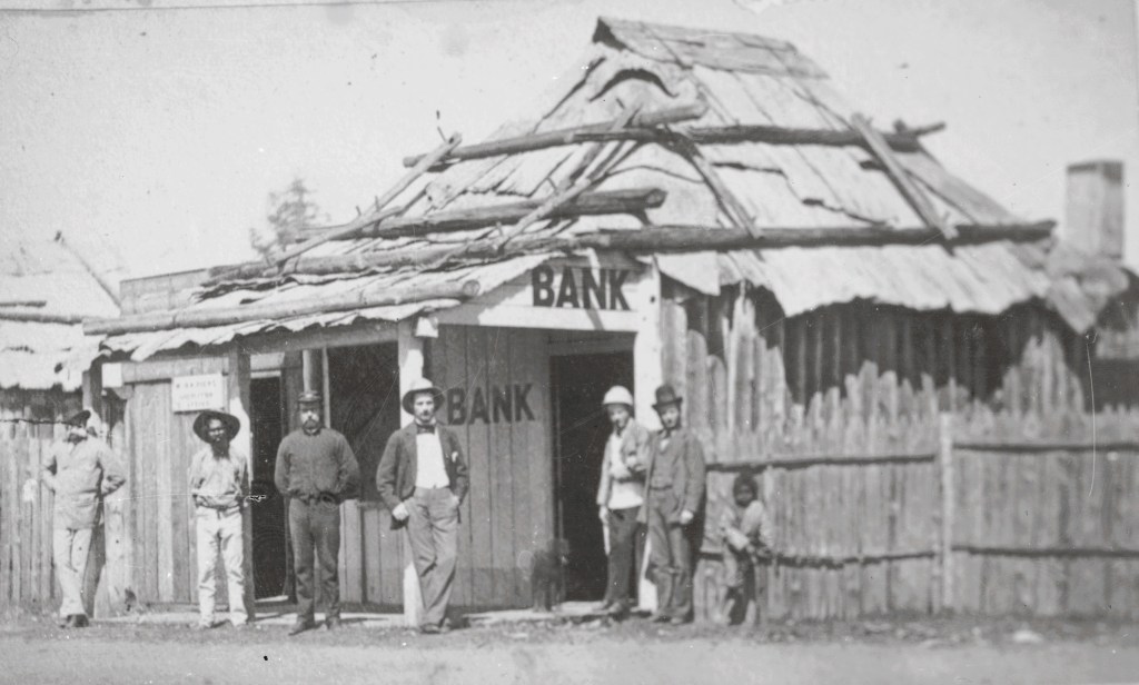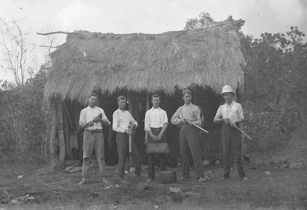 A group of young men with guns outside a bush hut in the Mackay area, 1881. There are other photographs from this group, but they involve rather a lot of dead wildlife, and I just couldn’t. Mind you, that hunters’ hut looks sturdier than the bank.