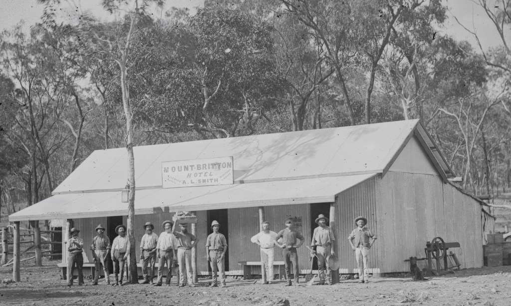A group of men photographed outside the Mount Britton Hotel in the Mackay region around 1880.
