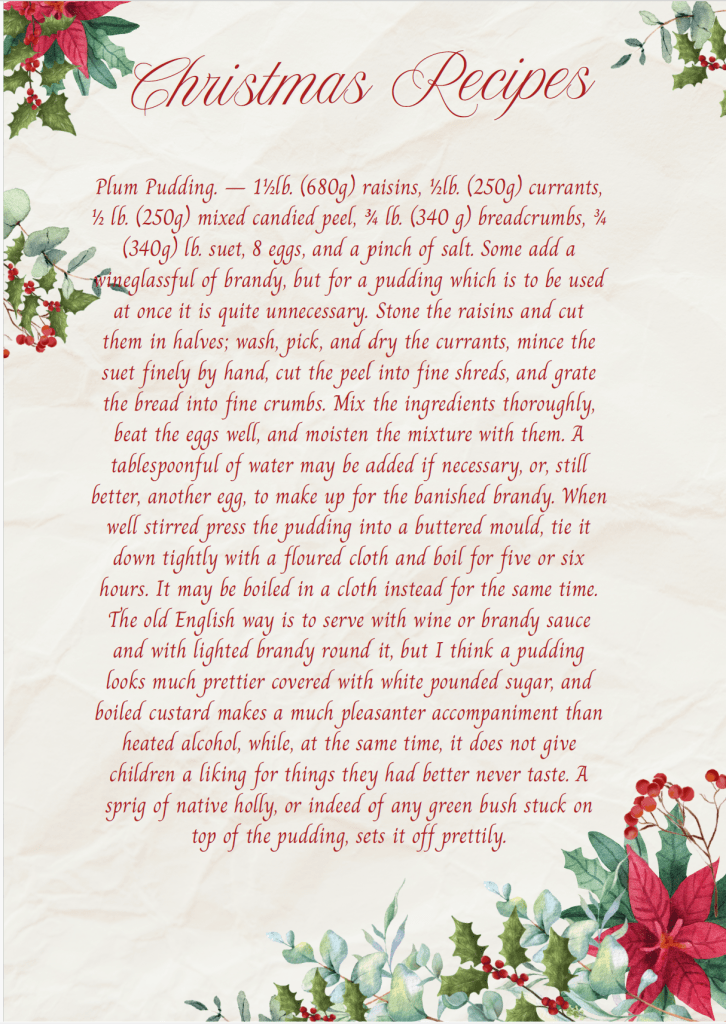 If the horror of being able to taste onion in one’s goose stuffing was something to be avoided, the plum pudding recipe protects innocent children from taste of the Demon Drink. (Caution: suet warning.)
