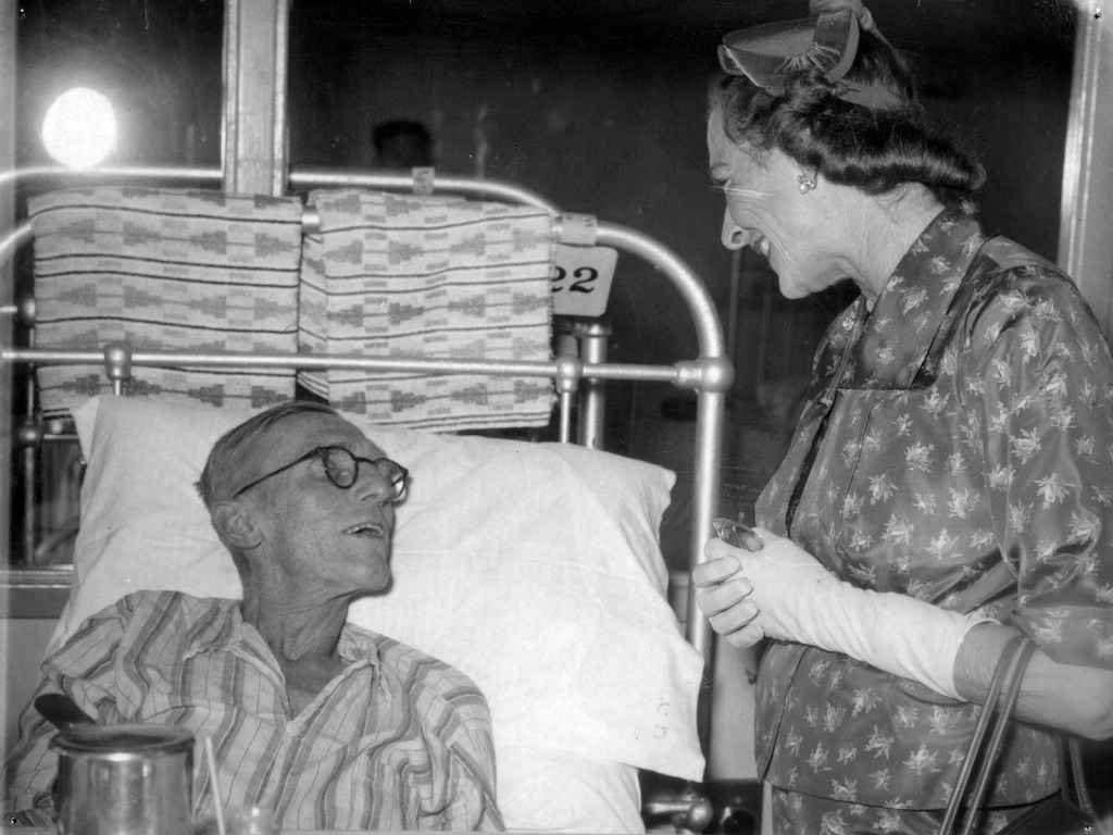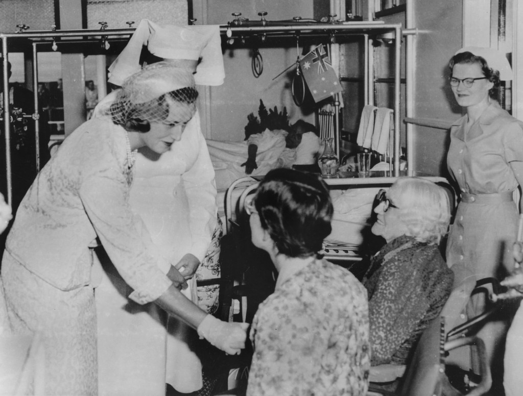 Left: Princess Alexandra greeting families at Greenslopes Hospital, 1959. Right: Edwina, Lady Mountbatten, with a patient at Greenslopes.
