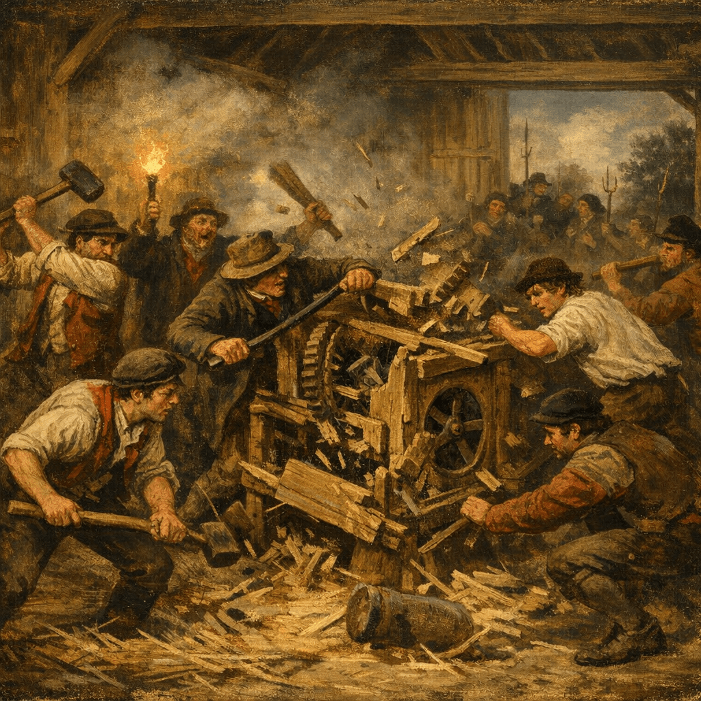 The centuries-old agricultural labouring system of England was transformed during the Georgian period. In the 1810s, weavers and textile makers began a series of protests against the factory owners whose adoption of labour-saving machines threatened their work, and by extension, their existence. These workers were followers of a probably fictional character named Ned Ludd and were given the deathless nickname of Luddites. Violence, arrests, executions and transportation ensued.