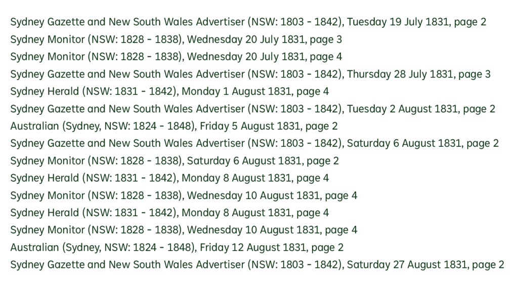 Apart from no-one mentioning his correct name in newspaper reports of the shooting on board the Eleanor, no-one seemed to know whether he was shot accidentally, and by whom. Perhaps he was just in the wrong part of the prison when the guns went off. He was also buried at St James’ Church of England, Sydney. [x]
