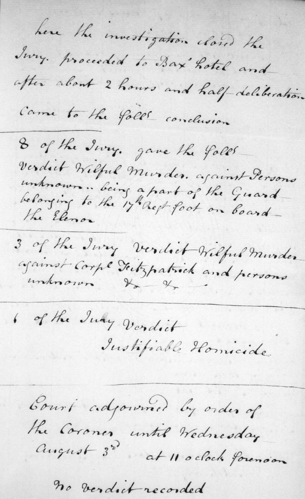 At the end of the witness examinations, on the night of Tuesday 3 August, Major Smeathman and the jury left the ship and the jury retired to the Australian Hotel to deliberate. The jury returned with sealed verdict letters. Eight jurors had returned a verdict of wilful murder by person or persons unknown. Three had returned a verdict of wilful murder by Corporal Fitzpatrick and other persons unknown. One juror returned a verdict of justifiable homicide.