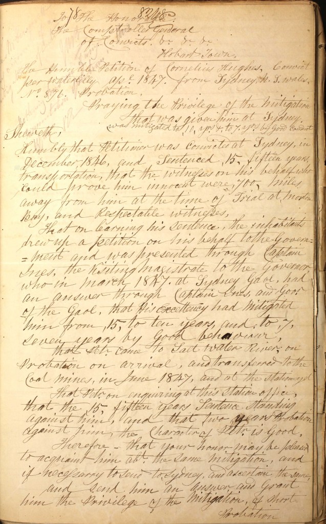 In early 1847, Cornelius Hughes found himself on a steamer named Waterlily, headed for Van Diemen’s Land. He was assigned to work at the Coal Mines Station. He was a well-conducted servant, and his employers were genuinely interested in helping him to obtain remissions and tickets of leave. Cornelius Hughes stated that he had received a remission of five years from the Governor of New South Wales, but the Tasmanian authorities had trouble verifying that at first. (Hughes was correct.)