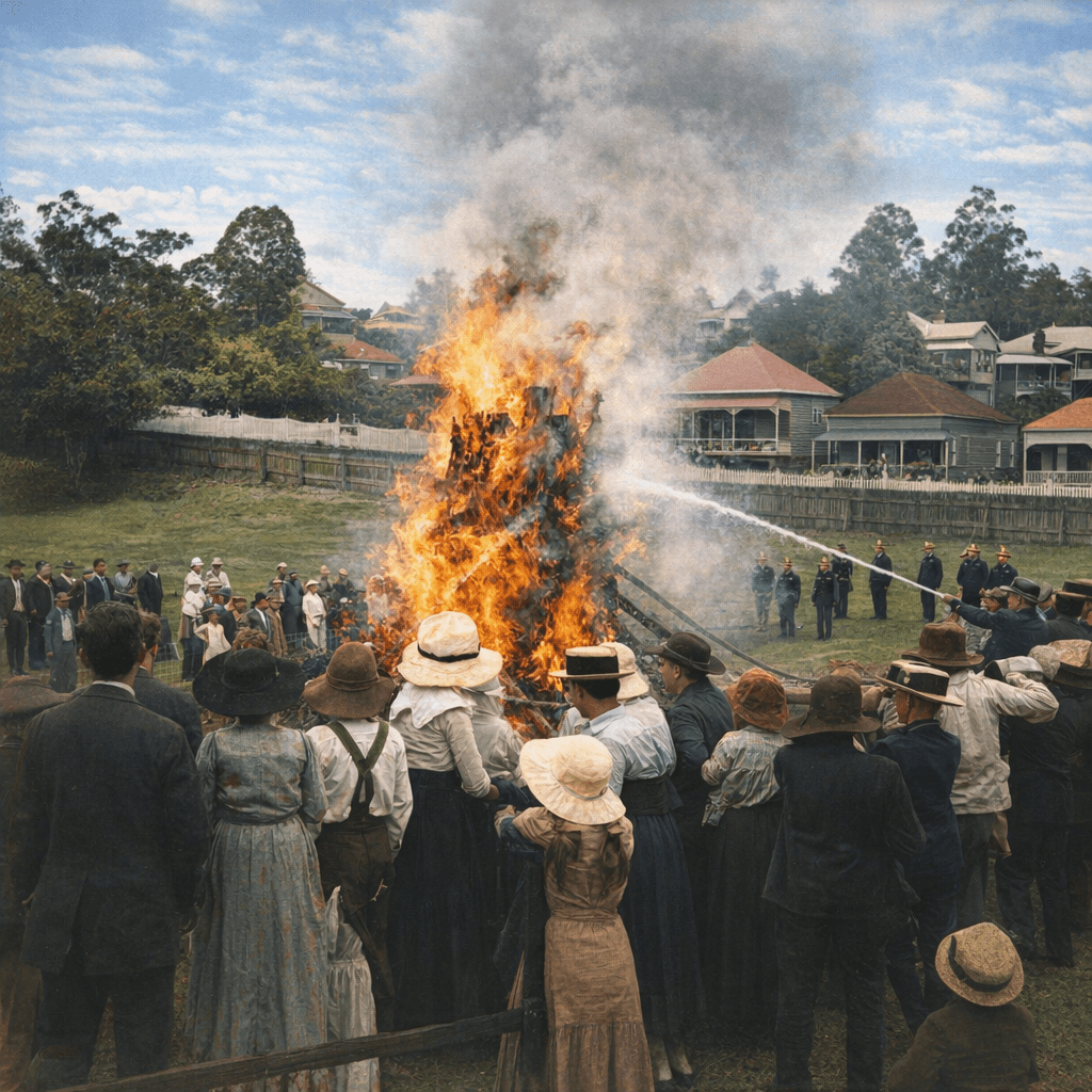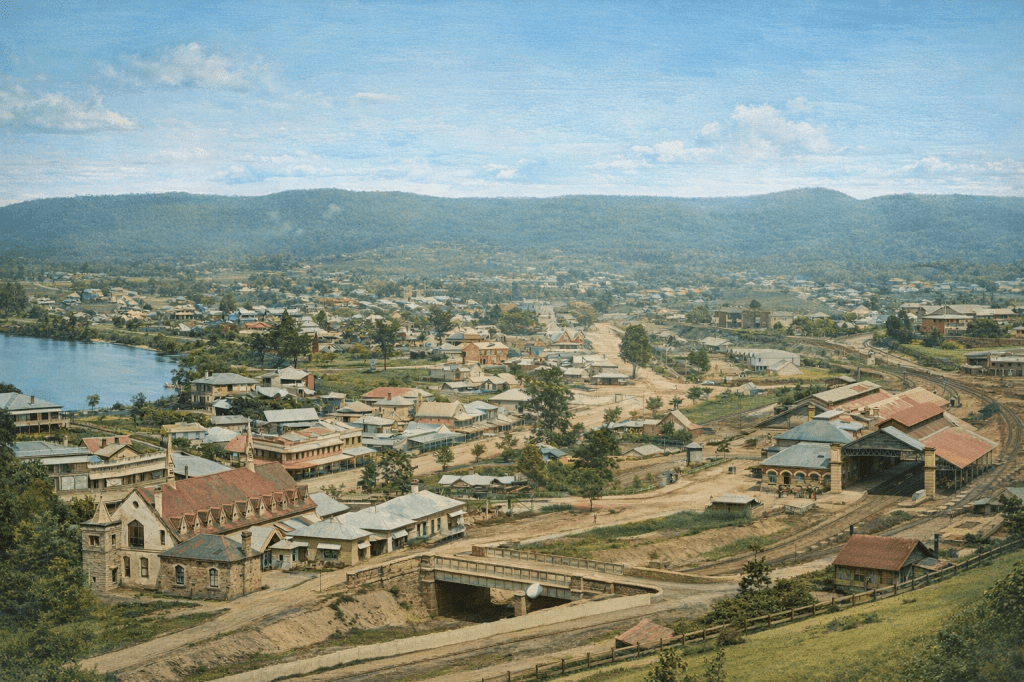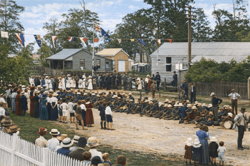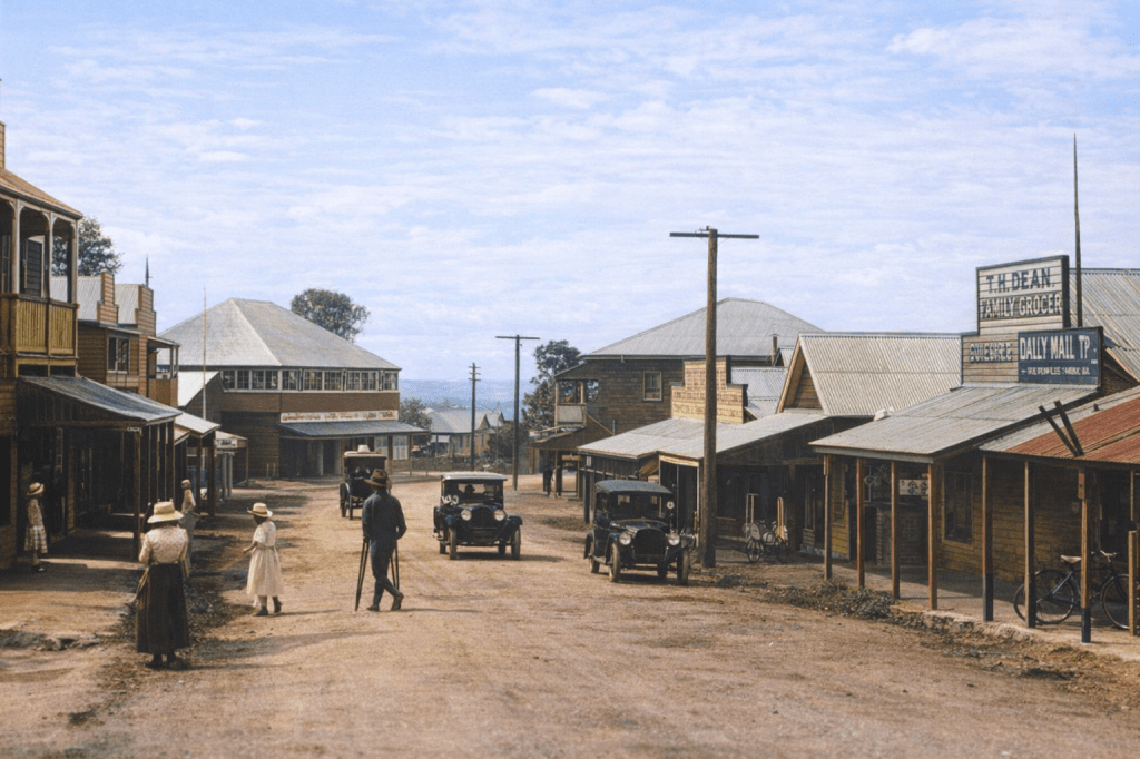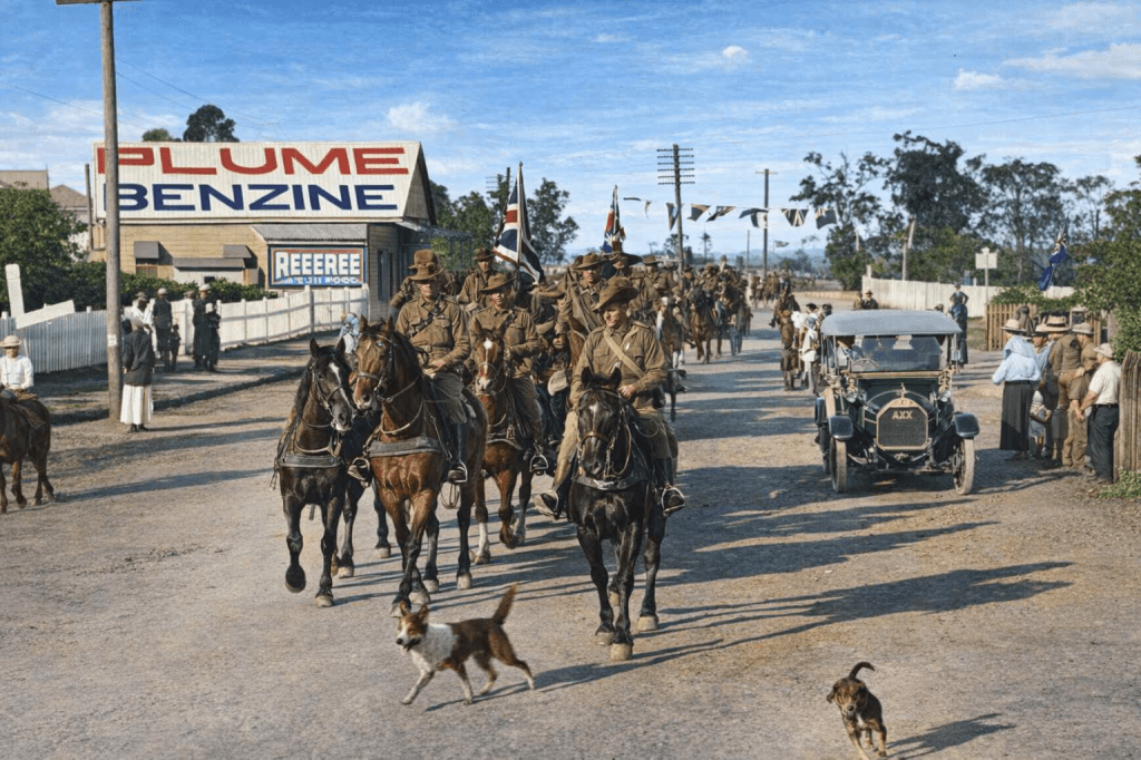 Grazing dairy cattle in a field, Moorooka, 1915.Waterlilies at Moorooka, 1905.Moorooka Congregational Church, 1911. So Ipswich Road, Moorooka always had heavy traffic! It’s 1915 and the Dungarees are headed off to war, to the delight of the local dogs.Dungarees resting during a march on Ipswich Road, 1915. I think the caption writer meant a march that took place on Ipswich Road, not that the Dungarees were going to take over the road, and storm a few local businesses. The locals have gathered to watch them take a spell.
