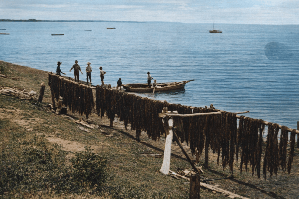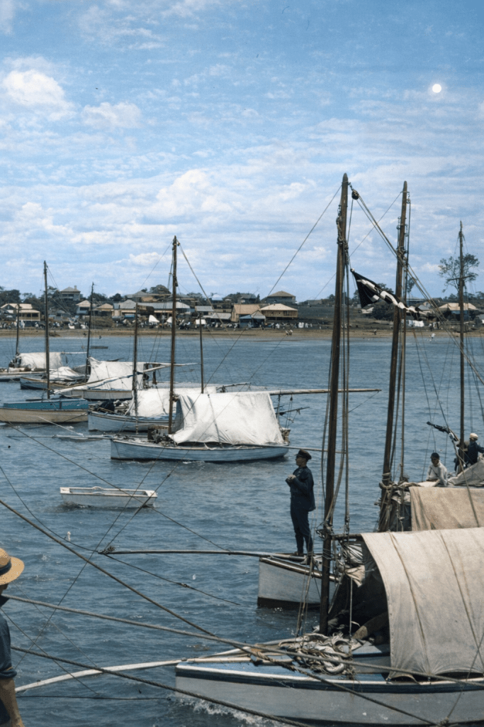 Sailing boats anchored offshore in Manly, 1912.Sailboat on the beach at Manly c 1890.Drying fish nets in the Wynnum/Manly area, c 1900.