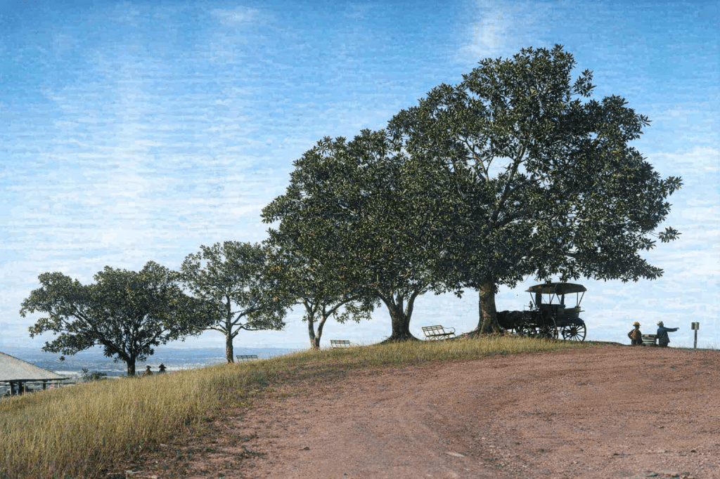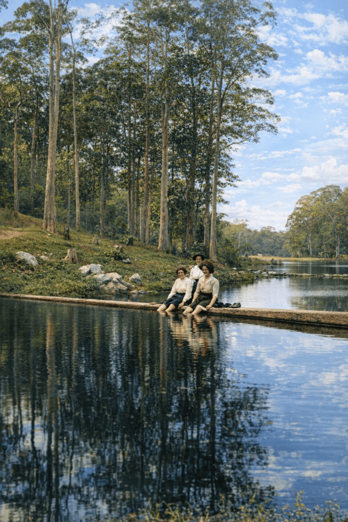 Fig trees at Mt Coot-tha c 1912. These trees were planted by King George V, and appear blithely unaware of the honour bestowed upon them.I say, that’s a bit too much leg, ladies! Well, at least you can’t see their ankles. They’re relaxing at a dam at Mount Coot-tha in 1915.Another view of Mount Coot-tha in 1915.