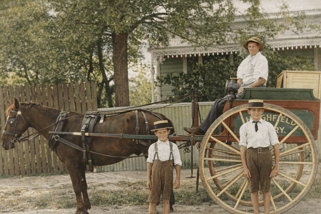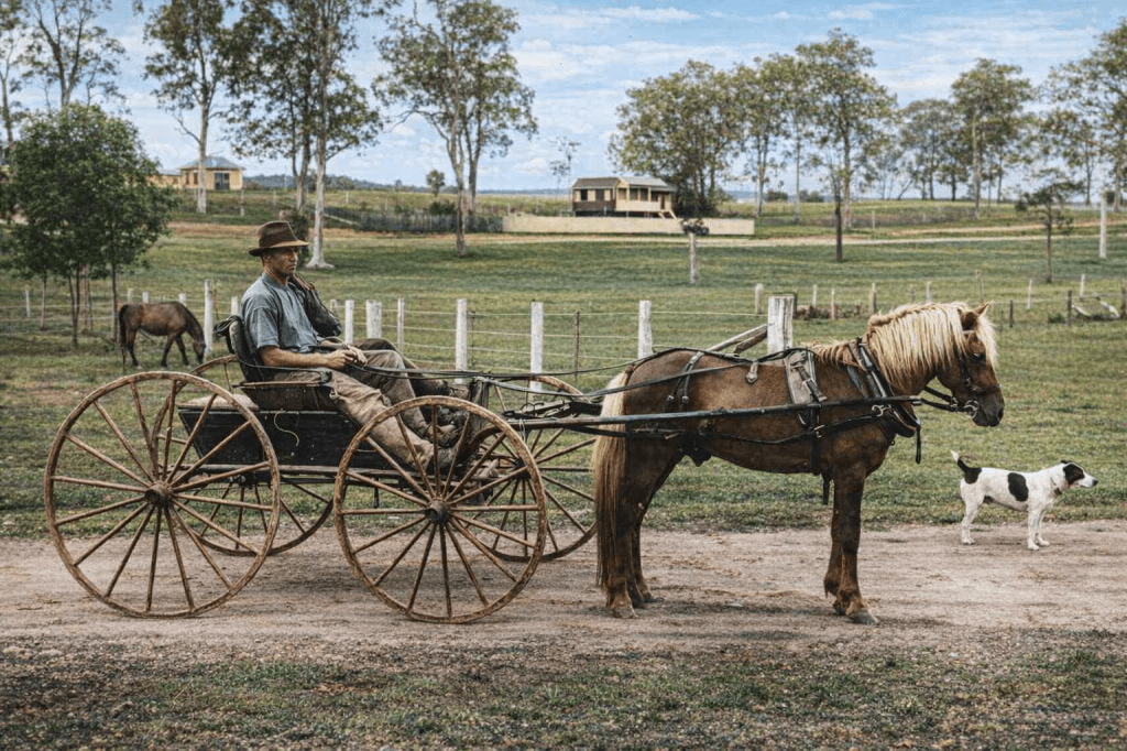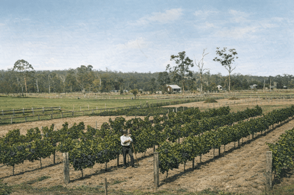 Samuel Taylor’s vineyard at Mitchelton, 1915.Frank Keylar and Ted Taylor in a horse-drawn vehicle at Mitchelton, 1920. I love the way the dog’s posture mimics that of the horse.