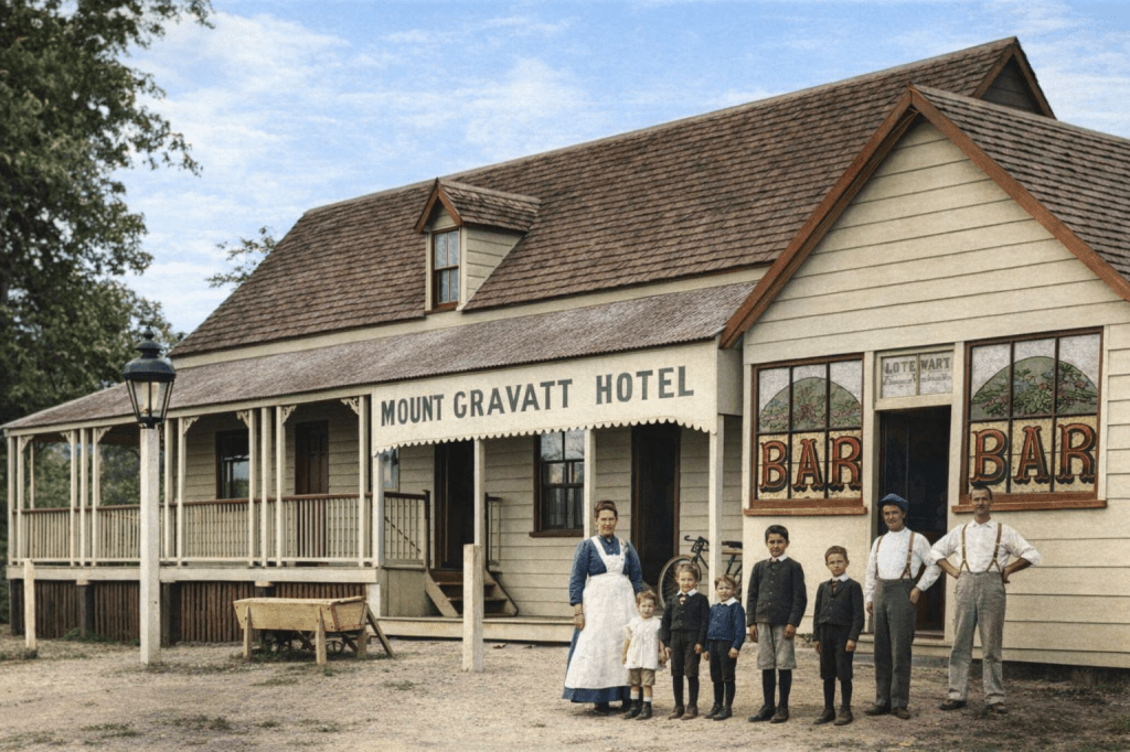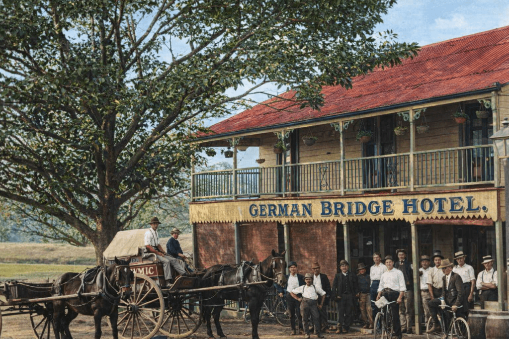The Flynn homestead, “Foilaclare” at Upper Mount Gravatt in 1910.Here’s Mr Glindemann with his dairy cart, and (presumably) his young sons, in 1914 at Mount Gravatt.The Mount Gravatt Hotel in 1905. If that’s a family concern, then kudos to Mum for raising five children and keeping the establishment going. I’m sure Pater helped too.Tea Rooms on Logan Road, Upper Mount Gravatt, c 1920. A century ago, people loved their tea rooms the way modern people love their coffee shops.Here we are at the German Bridge Hotel, Mount Gravatt in 1914, a year when anything labelled “German” might be thinking of a spot of rebranding.