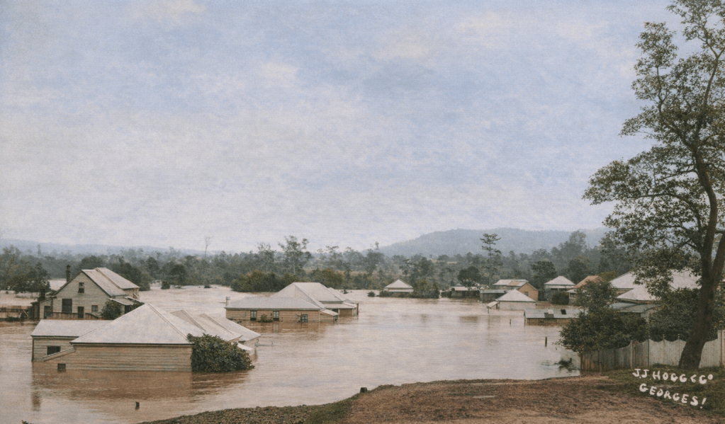 1889 photo of Roma Street and Milton.View across Milton Heights from Rosalie, 1914.Douglas Street, Milton underwater in the 1890 flood. Milton is close to the river, and has some low-lying areas that flood quite reliably every time there is a serious rain event. Stagecoach on the riverbank coming from Milton, 1895. This is the early iteration of Coronation Drive.