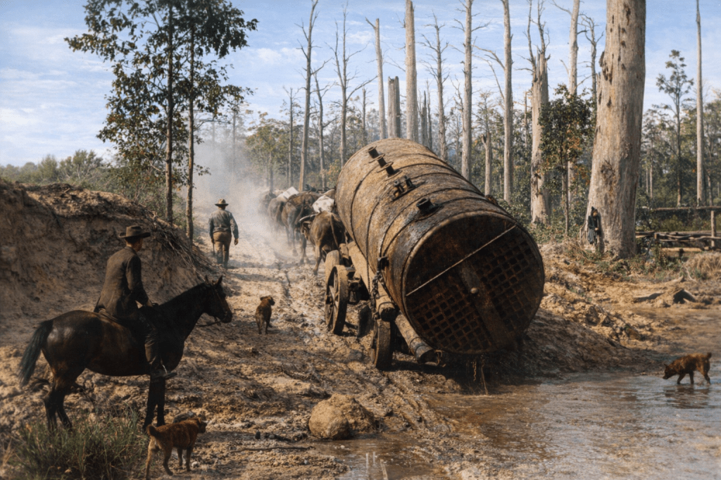 Wales’ Sawmill at Mount Crosby, 1891.Gustav Lofgren’s farm at Mount Crosby in 1897.This, the caption informs me, is a Lancashire boiler being transported to Mount Crosby in 1891, when heavy haulage was still the job of horses and bullocks. At least they took a few dogs along to keep everyone in line.Pumping station at Mount Crosby in 1912. Presumably where the Lancashire boiler ended up.