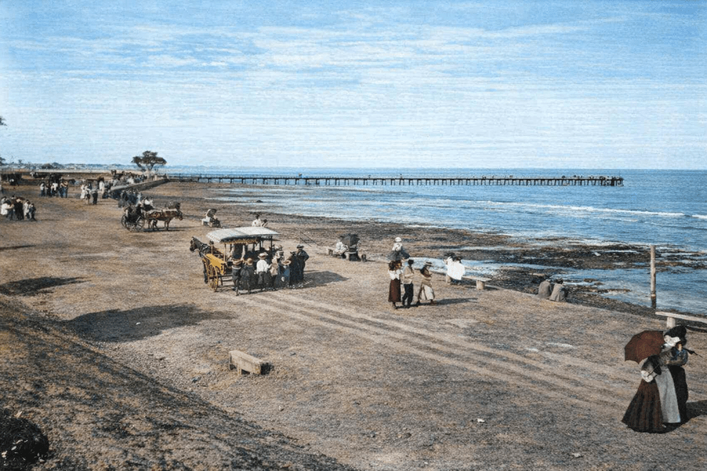 Playing on the foreshore at Manly, 1915.Changing boxes at Manly, c. 1905.People walking on the Esplanade near the Manly Jetty, 1900.