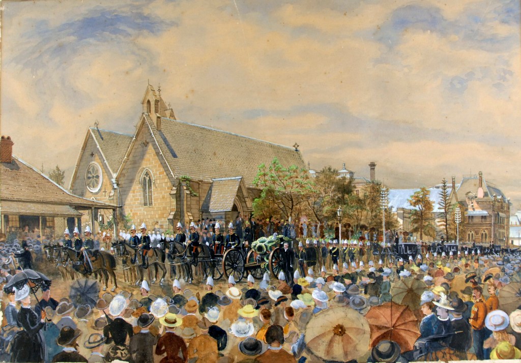 Sir Anthony Musgrave spent his life in Colonial service. He was born in the West Indies, and died 60 years later in office in Brisbane. At the time he began working in Queensland (1833), he enjoyed a sound working relationship with then-Premier, Sir Samuel Griffith, who shared his views. In 1888, Sir Anthony was contemplating retirement, but the election of Sir Thomas McIlwraith that year gave him pause. Sir Thomas did not, to put it mildly, share Sir Anthony’s views. Both men appealed to the Colonial Office in London about the powers of the Governor. Sir Thomas gained their support, and Sir Anthony Musgrave died quite suddenly and painfully not long afterwards, reportedly of strangulation of the bowels. His funeral is depicted in the artwork below: