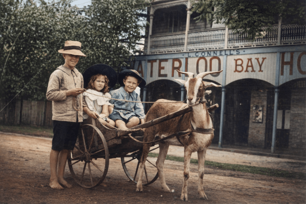 Curtiss’ Tea Gardens, Manly, c 1900.Road at Manly in the 1890s.Small wagon being pulled by a goat, pictured outside the Waterloo Bay Hotel, 1915. The boys are having fun. The little girl, not so much.Cambridge Parade, Manly, heading towards the Bay, 1916.