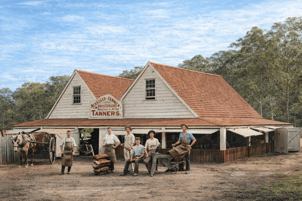 So many suburban tanners in the early days. This is the Keralgere Tannery in 1897, with some of its workers and wares.In 1889, this was the Norman Creek bridge. It later became the Morningside tram terminus.