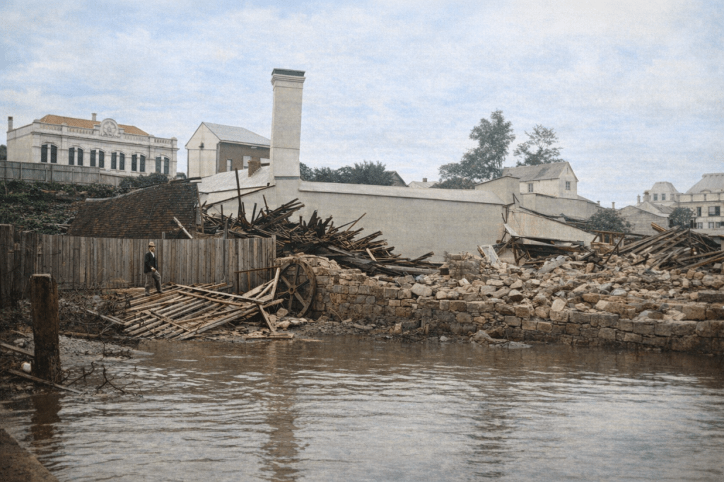 Sawmills were part of the lifeblood of a growing colonial town. The best-known sawmill in Brisbane was Pettigrew’s. William Pettigrew established a wharf and steam sawmill in early Brisbane, in the very heart of town, then expanded to major port towns all over Queensland. Pettigrew’s Brisbane sawmill burned down in 1855, was rebuilt, burned down again in 1874, was rebuilt, and then suffered calamitous damage in the 1893 and 1898 floods. The last flood was the final blow to Pettigrew’s enterprise, and he went insolvent that year.