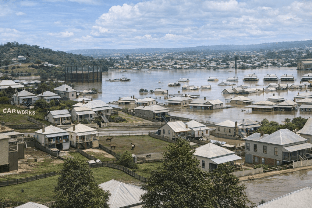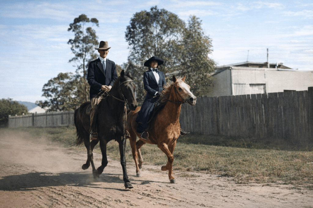 A view over Teneriffe in 1893, showing the flooding. (The original photo notation said “gasworks” not “carworks,” but I’ll forgive AI because it got rid of so much damage on the upper part of the picture.)Two riders cantering along a street in Teneriffe, ca 1918.