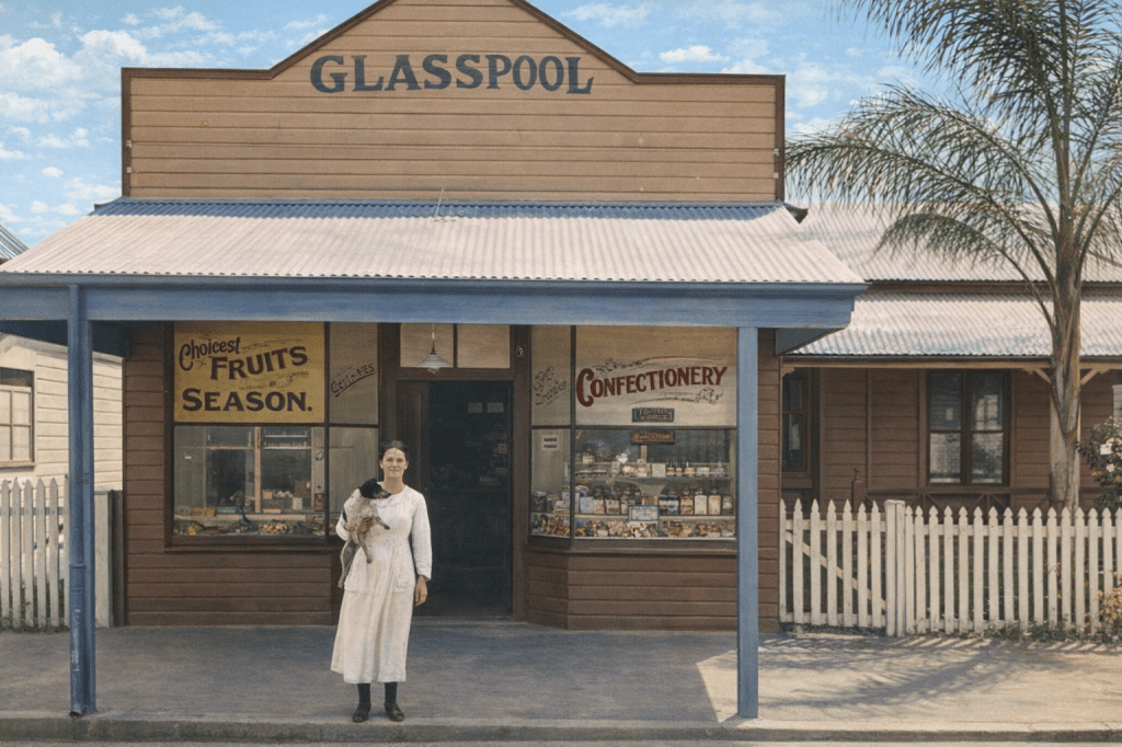 1901: An afternoon walk along Swann Road, Taringa.1911: A group of women and girls by the river at Taringa.In 1920, a woman and her little dog pose outside Glasspool’s Confectionery Shop in Taringa.