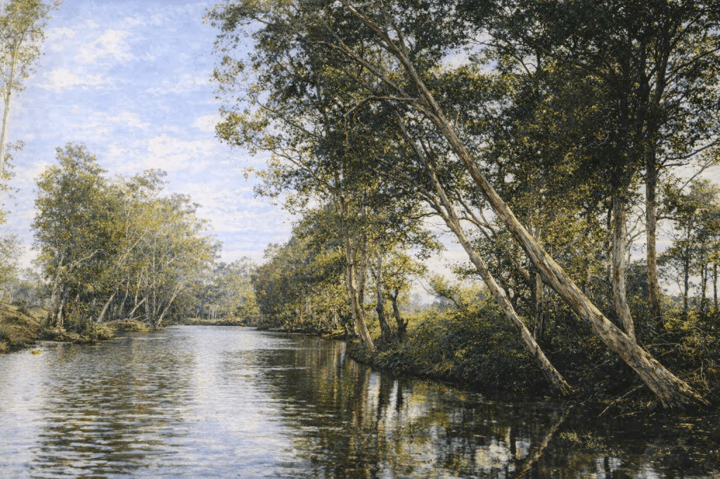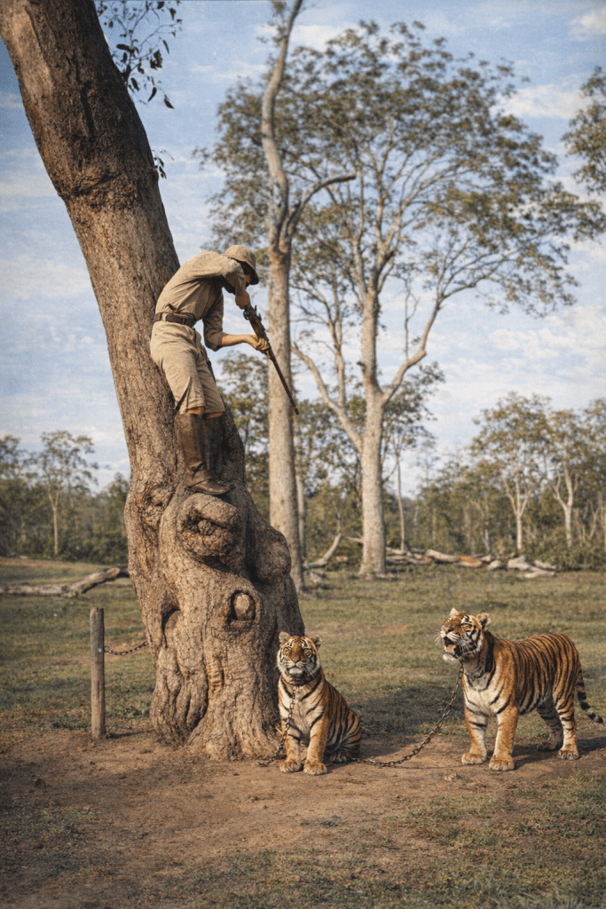 In 1888, Charles Higgins, of Higgins’ Tiger Menagerie, poses with one of his tigers and two understandably apprehensive young ladies at Toombul.A staged photo of James Trackson “shooting tigers” at Higgins’ Menagerie. (Note that the tigers are chained up, and besides, Mr Higgins wouldn’t want to have part of his livelihood taken away by suburban thrill-seekers.)The tree-lined Kedron Brook at Toombul in 1910.