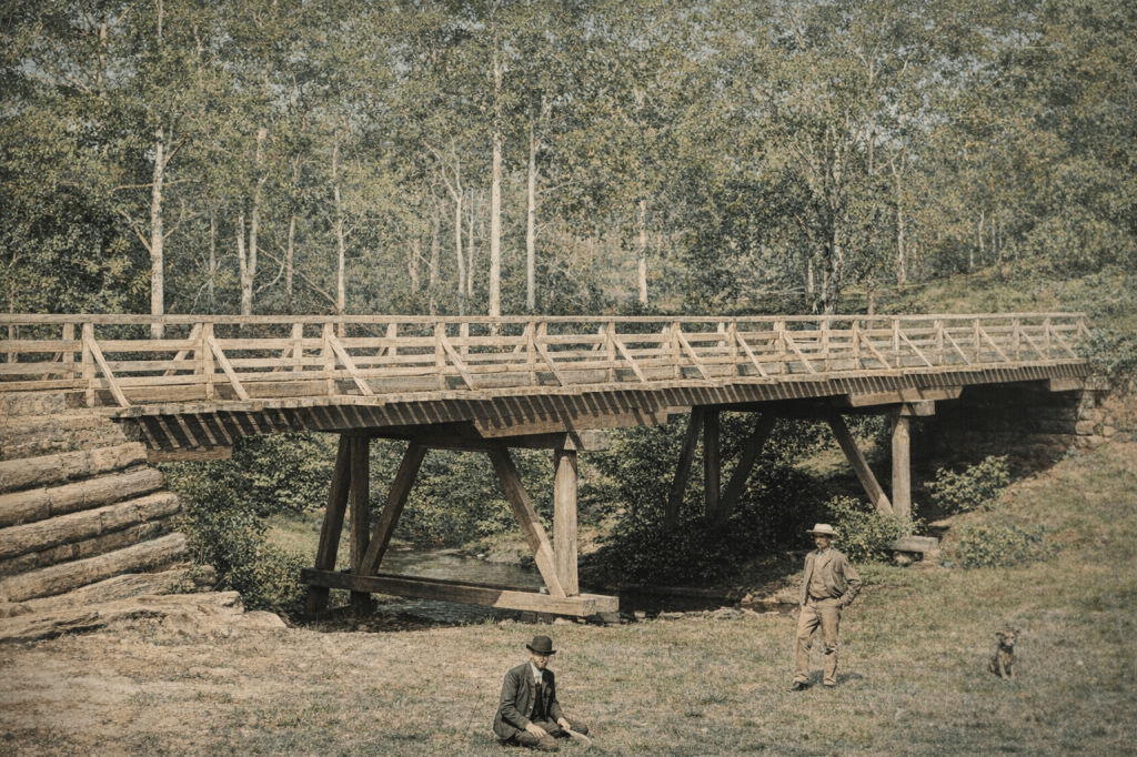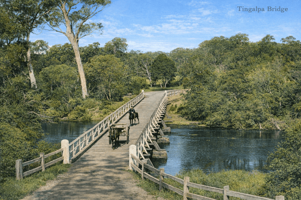In 1876, a horse-drawn vehicle stops at the Royal Mail Hotel in Tingalpa.The Tingalpa Bridge in 1908.